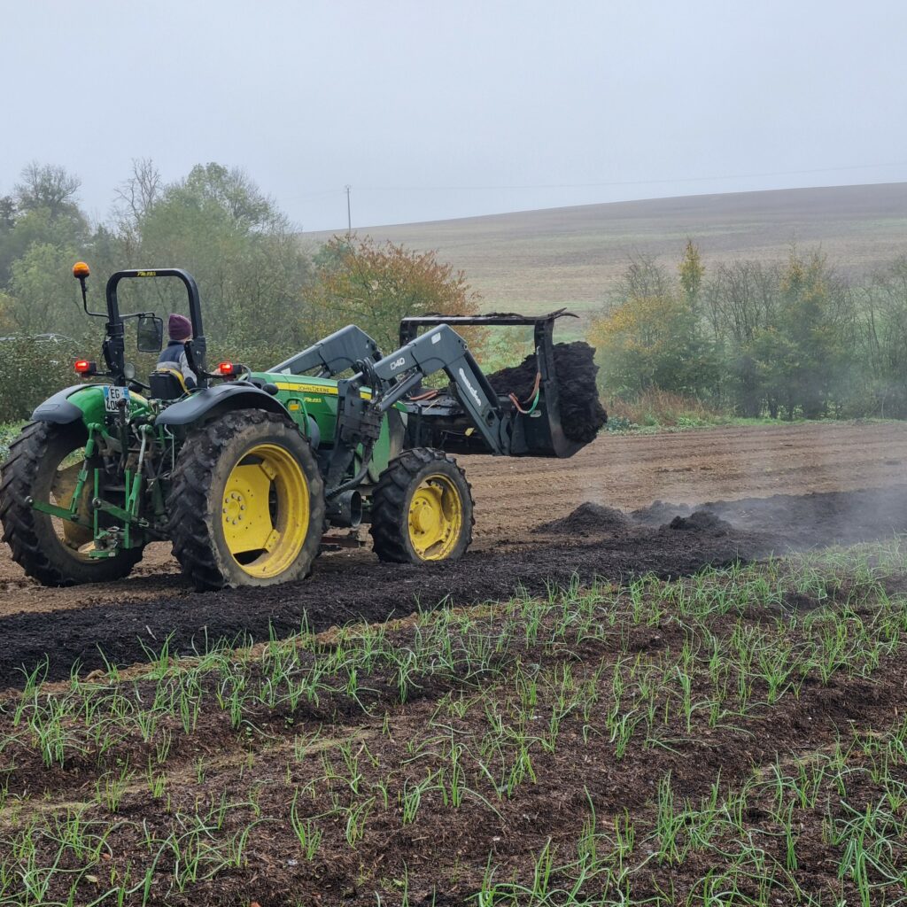 - L’arrêt complet (ou quasi) de l’usage du paillage plastique (pratique très répandue chez les maraichers Bio pour limiter l’enherbement, et donc le désherbage des cultures). Nous avons remplacé les films plastiques (très mauvais pour le bilan carbone !) par l’emploi massif de compost issu d’un centre de compostage. A présent nous stockons donc du carbone.