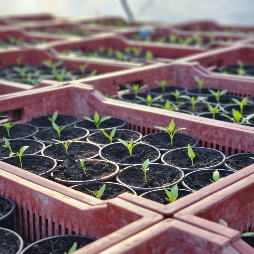Une partie des plants sont confectionnés à la ferme, c’est le cas par exemple pour les courgettes, les haricots, les tomates ou les blettes. Pour ces plants « maison » et pour les espèces semées directement en pleine terre (par exemple les carottes ou les navets), nous choisissons nos variétés essentiellement parmi celles dites de « population », à savoir des variétés non-hybrides1, autrement encore appelées « paysannes », semences reproductibles, sans propriété intellectuelle ni royalties à payer, non OGM, non CMS2, sélectionnée plutôt pour leur rusticité que pour leur standardisation, plutôt pour leur goût que pour leur productivité, chez des semenciers certifiés Bio.